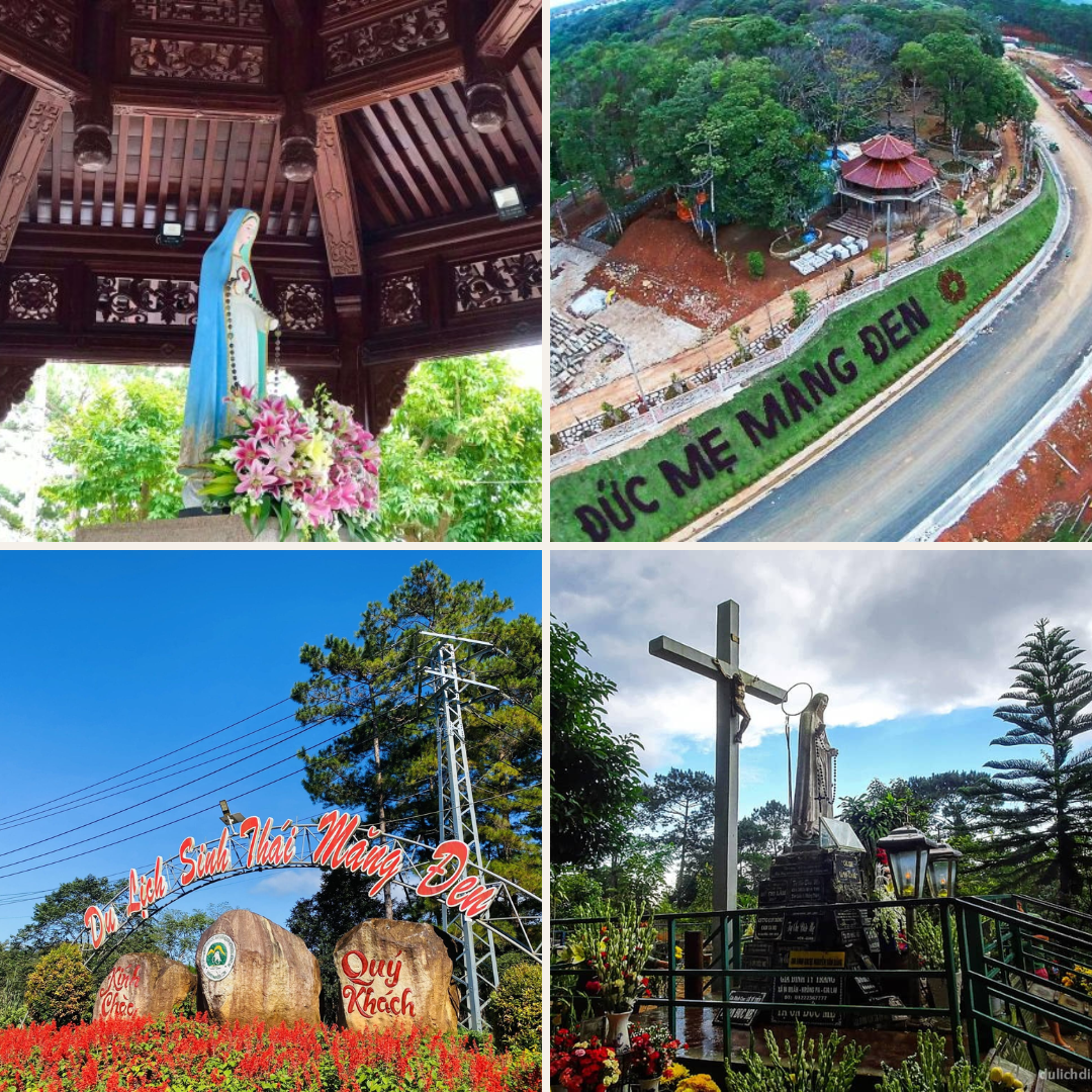 - Tượng Đức Mẹ Măng Đen: một biểu tượng tôn giáo thiêng liêng và nổi tiếng tại vùng đất cao nguyên Măng Đen. Bức tượng được tạc từ đá trắng, cao khoảng 1 mét, với dáng vẻ hiền từ, bao dung, thể hiện sự che chở và lòng nhân ái. Đây là điểm hành hương quan trọng không chỉ đối với người dân địa phương mà còn với du khách thập phương tìm đến để cầu nguyện và tìm sự bình an trong tâm hồn. Không chỉ mang giá trị tâm linh sâu sắc, nơi đây còn là một điểm dừng chân thanh bình giữa thiên nhiên hoang sơ, thu hút những ai muốn tạm rời xa cuộc sống xô bồ, lắng đọng giữa không gian núi rừng trong lành, tĩnh lặng.
