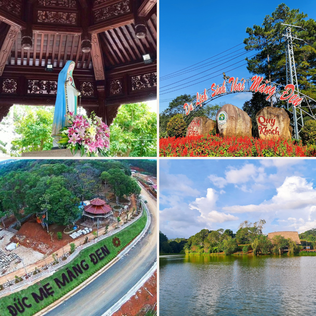 - Tượng Đức Mẹ Măng Đen: một biểu tượng tôn giáo thiêng liêng và nổi tiếng tại vùng đất cao nguyên Măng Đen. Bức tượng được tạc từ đá trắng, cao khoảng 1 mét, với dáng vẻ hiền từ, bao dung, thể hiện sự che chở và lòng nhân ái. Đây là điểm hành hương quan trọng không chỉ đối với người dân địa phương mà còn với du khách thập phương tìm đến để cầu nguyện và tìm sự bình an trong tâm hồn. Không chỉ mang giá trị tâm linh sâu sắc, nơi đây còn là một điểm dừng chân thanh bình giữa thiên nhiên hoang sơ, thu hút những ai muốn tạm rời xa cuộc sống xô bồ, lắng đọng giữa không gian núi rừng trong lành, tĩnh lặng.